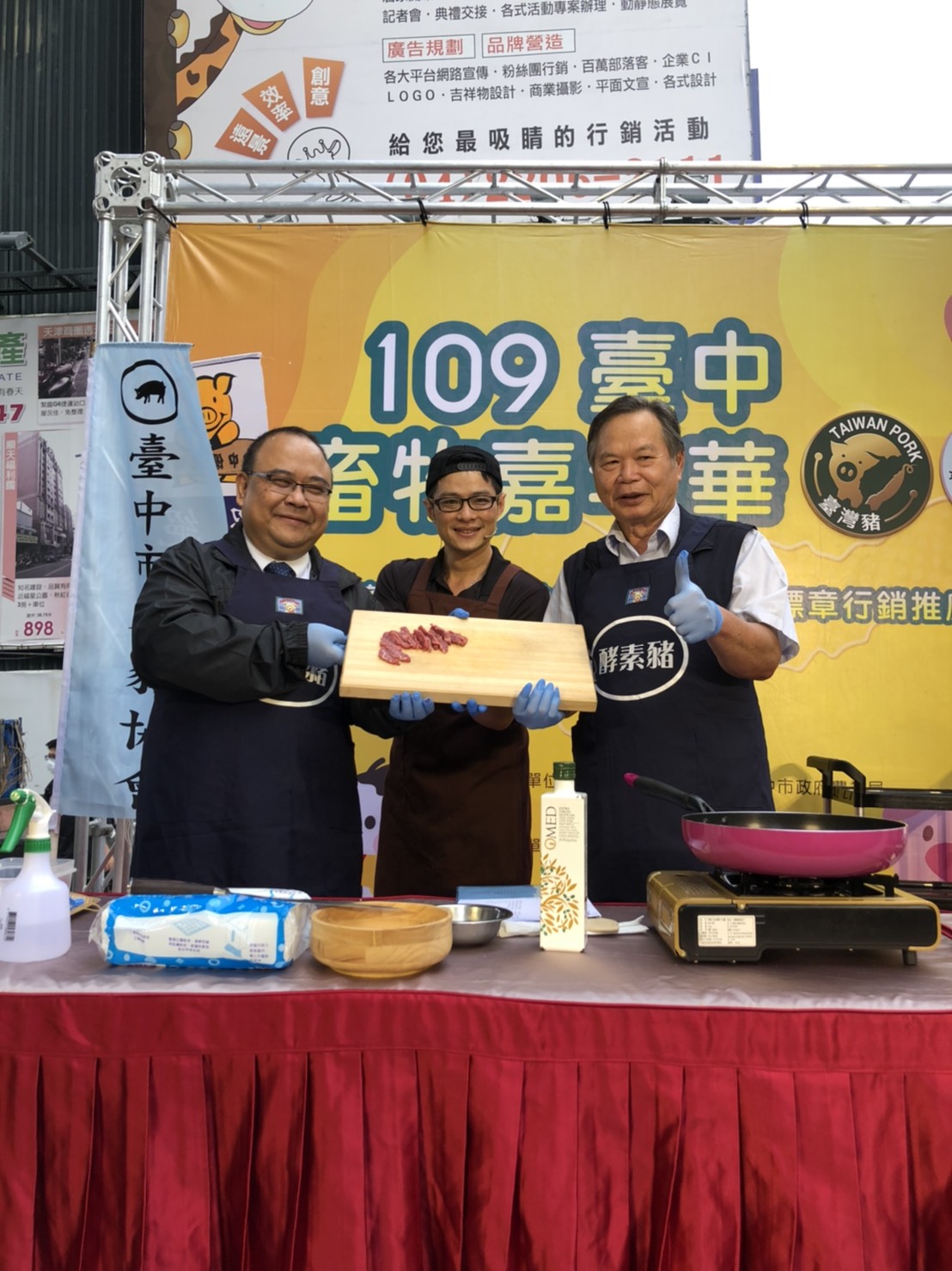 今日活動,農業局長蔡精強及行政院農委會畜牧處副處長江文全化身一日主廚,示範做出台中市優質畜牧食材創意料理,鼓勵民眾選用低碳足跡在地食材外,現場也與產業團體代表共同宣誓「台中無萊豬、畜產安心吃」,讓市民能夠放心採買、安心食用台中在地國產畜產品。