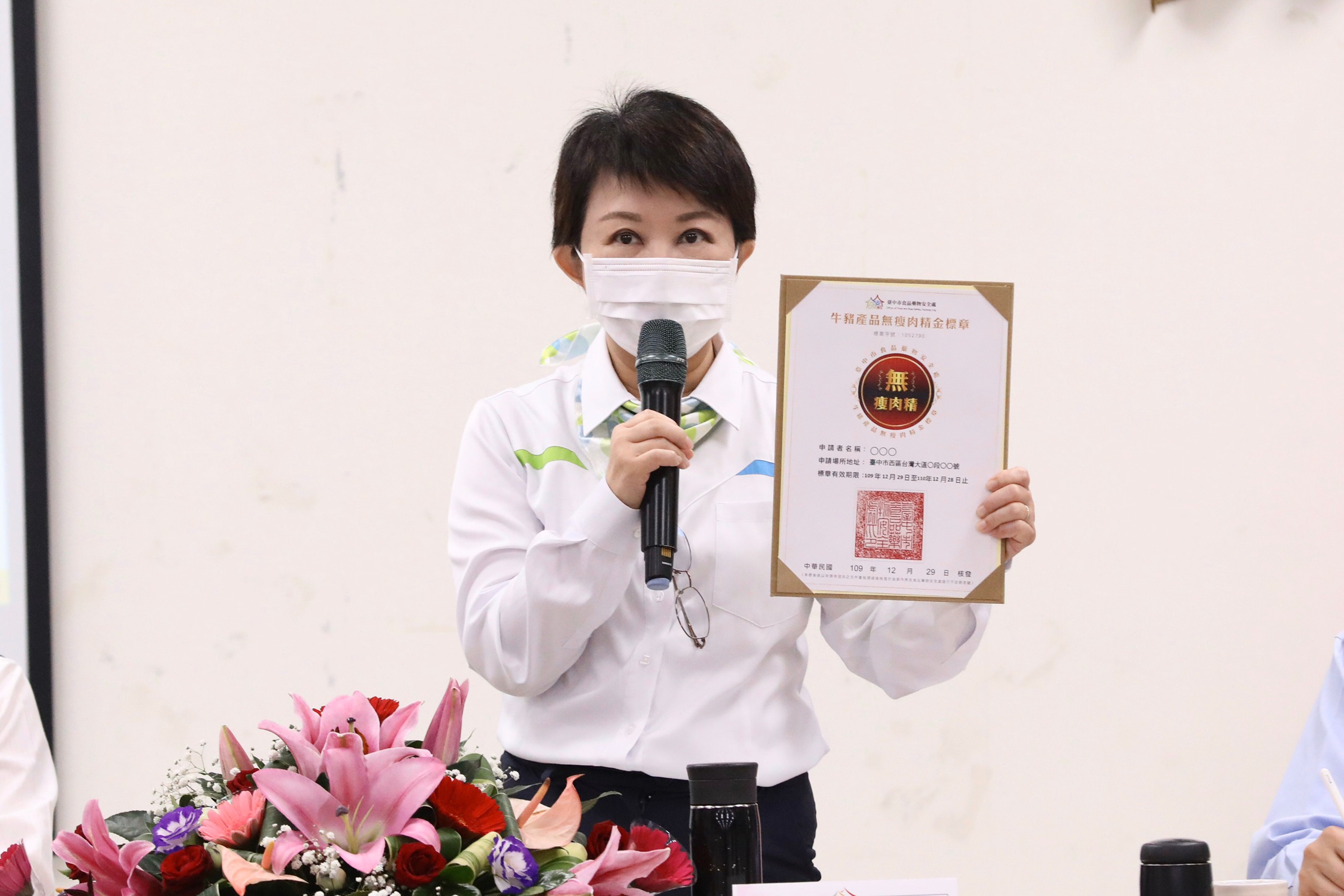 嚴防含瘦肉精美豬牛,台中市政府領先全國推出「牛豬產品無瘦肉精金標章」供轄內業者申請,業者須提出相關檢驗報告、產地證明文件及來源供貨商清冊,經市府審核通過後核發標章,效期一年,市府更將不定期前往稽查抽驗,如驗出肉品含瘦肉精,除依法加重裁罰,也將廢止標章;市長盧秀燕鼓勵全市商家店舖努力申請張貼,共同守護市民食的安全。