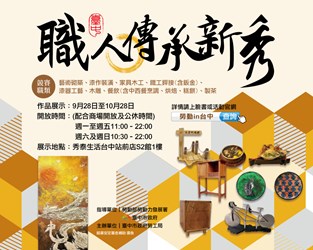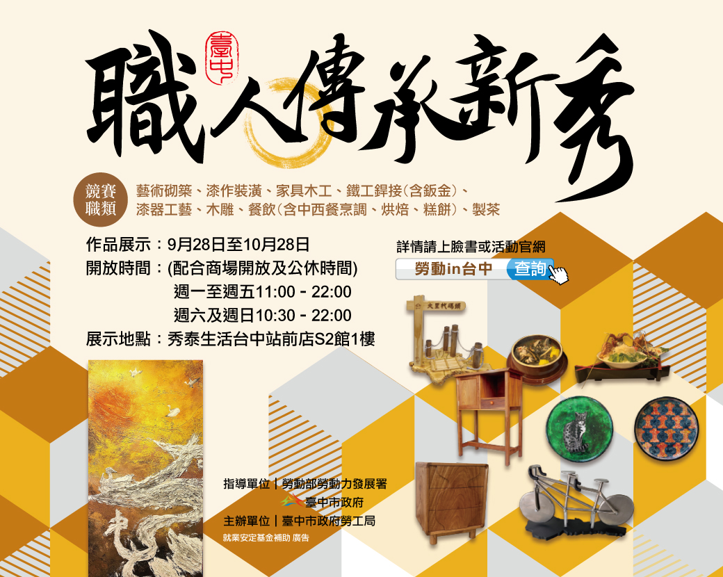 台中市政府勞工局舉辦111年職人傳承新秀選拔活動,涵蓋藝術砌築、漆作裝潢、家具木工、鐵工銲接、漆器工藝、木雕、餐飲、製茶8項職類,共評選出32組(64人)職人暨新秀,得獎作品自今(28)日起至10月28日在秀泰生活台中站前店S2館1樓展出,歡迎民眾踴躍參觀。勞工局長張大春表示,今年選拔特要求作品融入「台中市人文地景藝術」,除具傳承意義,也能宣傳台中之美。