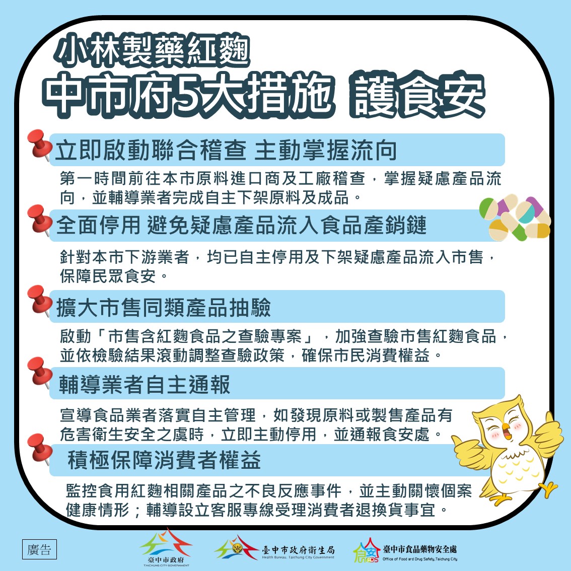 面對日本小林製藥公司生產的紅麴原料疑似導致腎疾病事件,中市府已全數掌握進口紅麴原料流向,並透過5大措施守護食安