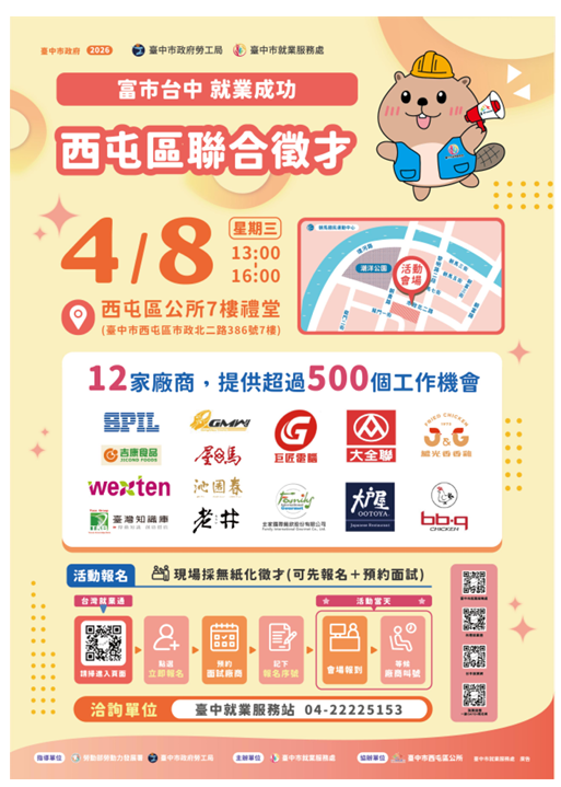 臺中市政府4月8日(三)13:00-16:00,在臺中市西屯區公所7樓禮堂舉辦2026「富市台中 就業成功」西屯區聯合徵才,邀請屋馬燒肉、大全聯、矽品、共茂工業及吉康食品等12家廠商徵才,提供500個工作機會,查詢相關資訊請上:https://gov.tw/Udb,洽詢電話04-22225153。